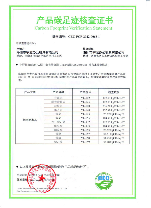 洛陽市宇龍辦公機具有限公司-CEC-PCF-2022-0068-1-鋼木類家具