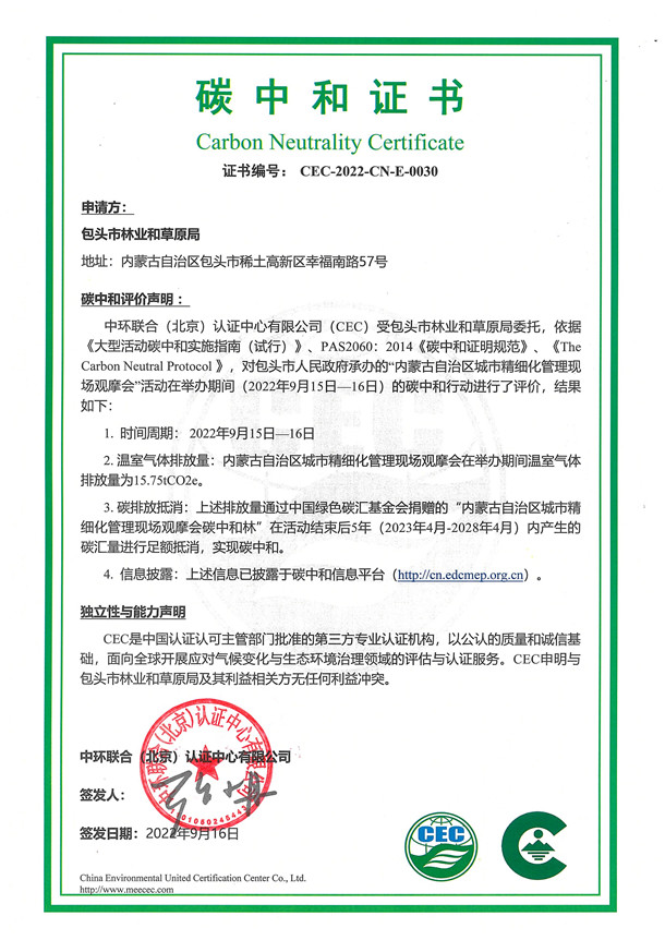 包頭市林業和草原局碳中和證書-CEC-2022-CN-E-0030