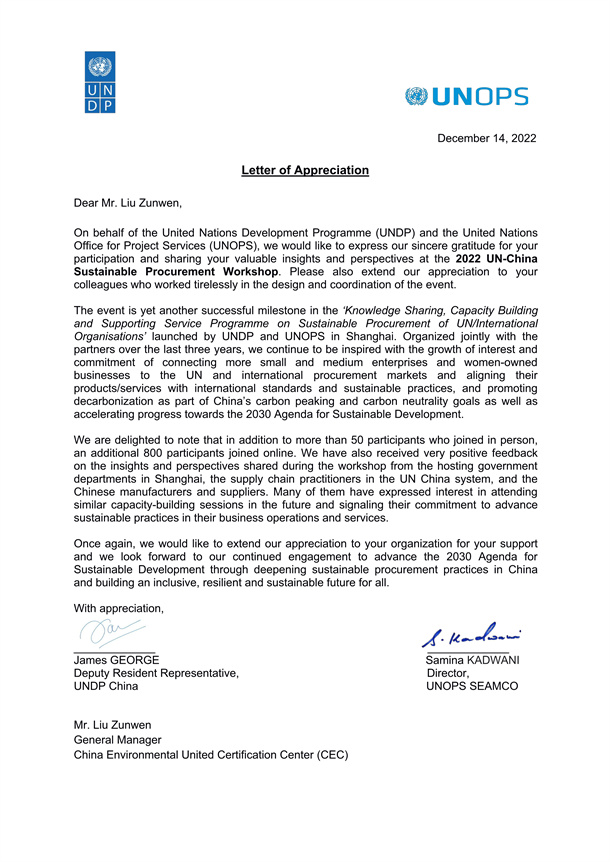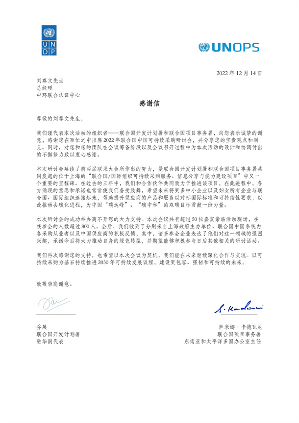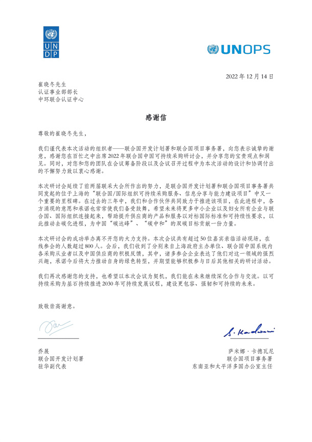 近日,聯(lián)合國開發(fā)計劃署和聯(lián)合國項目事務(wù)署向中環(huán)聯(lián)合認(rèn)證中心發(fā)來感謝信,對中環(huán)聯(lián)合認(rèn)證中心代表在2022年聯(lián)合國中國可持續(xù)采購研討會的精彩分享表示感謝,并希望以此為契機(jī),繼續(xù)深化合作交流,共同推進(jìn)2030年可持續(xù)發(fā)展議程,建設(shè)更包容、 強(qiáng)韌和可持續(xù)的未來。